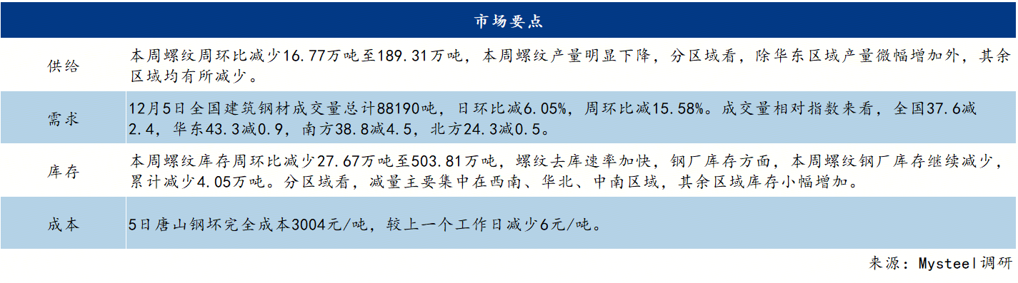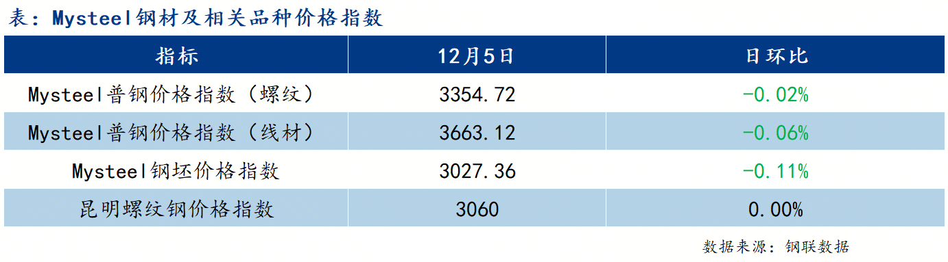 12月5日国内城市建筑钢材价格涨跌互现,淡季需求不佳。具体来看,早盘期螺窄幅震荡运行,国内多数城市建筑钢材现货价格暂稳,部分小幅回调,市场成交氛围一般。午后期螺延续震荡运行,部分地区市场现货价格向低位靠拢,多空博弈中,终端多持谨慎观望的态度,市场成交有所缩量。西南地区规格紧缺,厂商挺价意愿较强,基本面矛盾尚不尖锐,但下游需求愈加清淡,市场观望情绪浓厚,预计短期建筑钢材现货价格或延续窄幅震荡运行。全国建筑钢材成交量总计88190吨,日环比减6.05%。